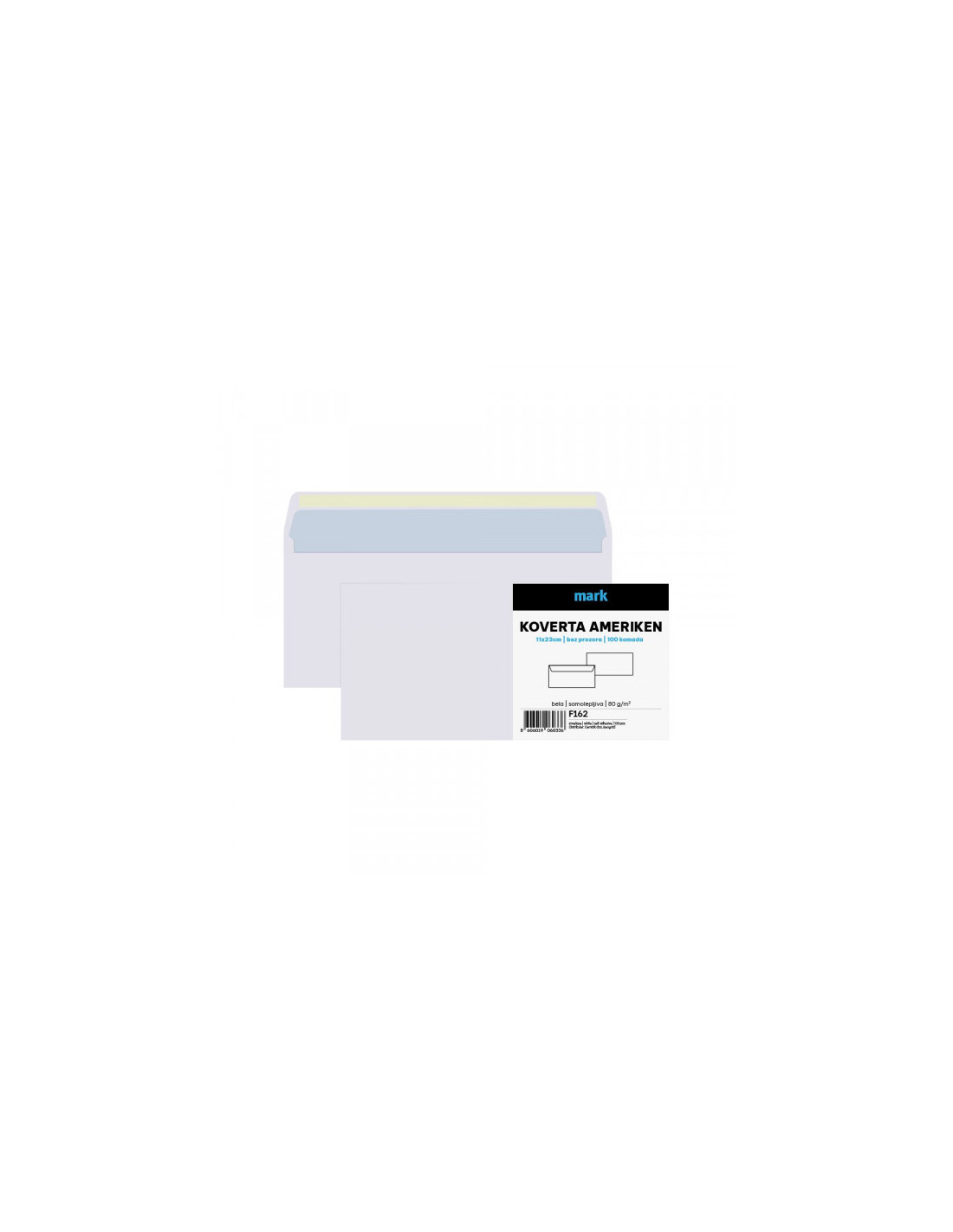 – Ameriken koverte u pakovanju od 100 komada– Papir 80g– Samolepljiva– Bez prozora– Dimenzija koverte: 11x23cm